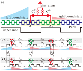(b)借助circuit-QED特有的巨型原子效应,我们发现束缚态空间对称性会被量子干涉效应破坏。基于该效应,可以实现量子芯片上中比特的手性耦合,并且耦合强度和方向可以任意调节。我们还探索了其在量子凝聚态物质模拟中的应用。这些研究为可扩展的大规模量子计算提供了新的思路[Phys. Rev. Lett. 126, 043602 (2021)]。