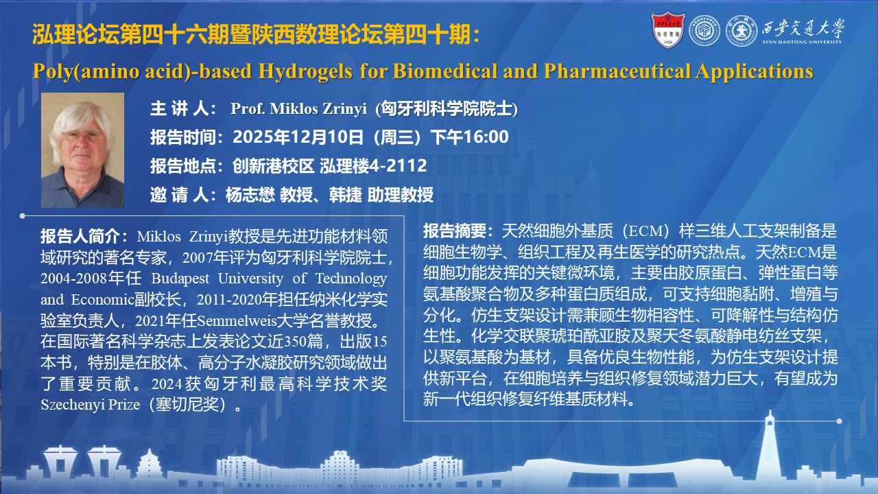 【泓理论坛第四十六期暨陕西数理论坛第四十期】—— Poly(amino acid)-based Hydrogels for Biomedical and Pharmaceutical Applications