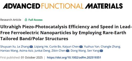 上述研究成果近期以《Ultrahigh Piezo-Photocatalysis Efficiency and Speed in Lead-Free Ferroelectric Nanoparticles by Employing Rare-Earth Tailored Band/Polar Structures》为题,发表于国际权威期刊《Advanced Functional Materials》。成人影院-国产成人影院