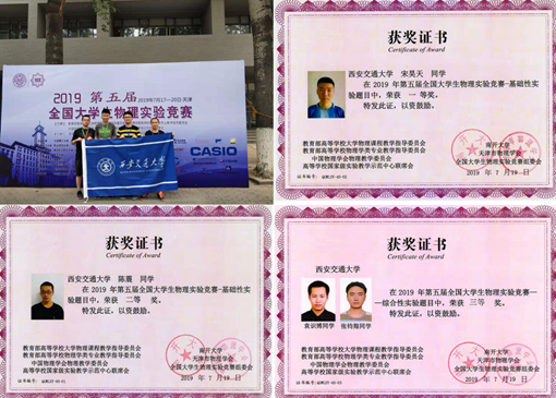 物理试验班四名本科生组成了我校代表队,理学院实验物理教学中心组成的指导教师团队与参赛队的几位同学利用课余时间,投入大量精力对基础性实验和综合设计性实验的理论背景和实验技能进行了系统梳理和实际操作。通过系统训练,竞赛中几位参赛同学以严谨的科学态度、深厚的理论功底、扎实的实验技术获得优异成绩。其中,宋昊天同学(物试72)获得全国一等奖,陈震同学(物试72)获得全国二等奖,袁识博同学(物试61)和张钧翔同学(物试62)获得全国三等奖,我校代表队整体表现在参赛高校中名列前茅。